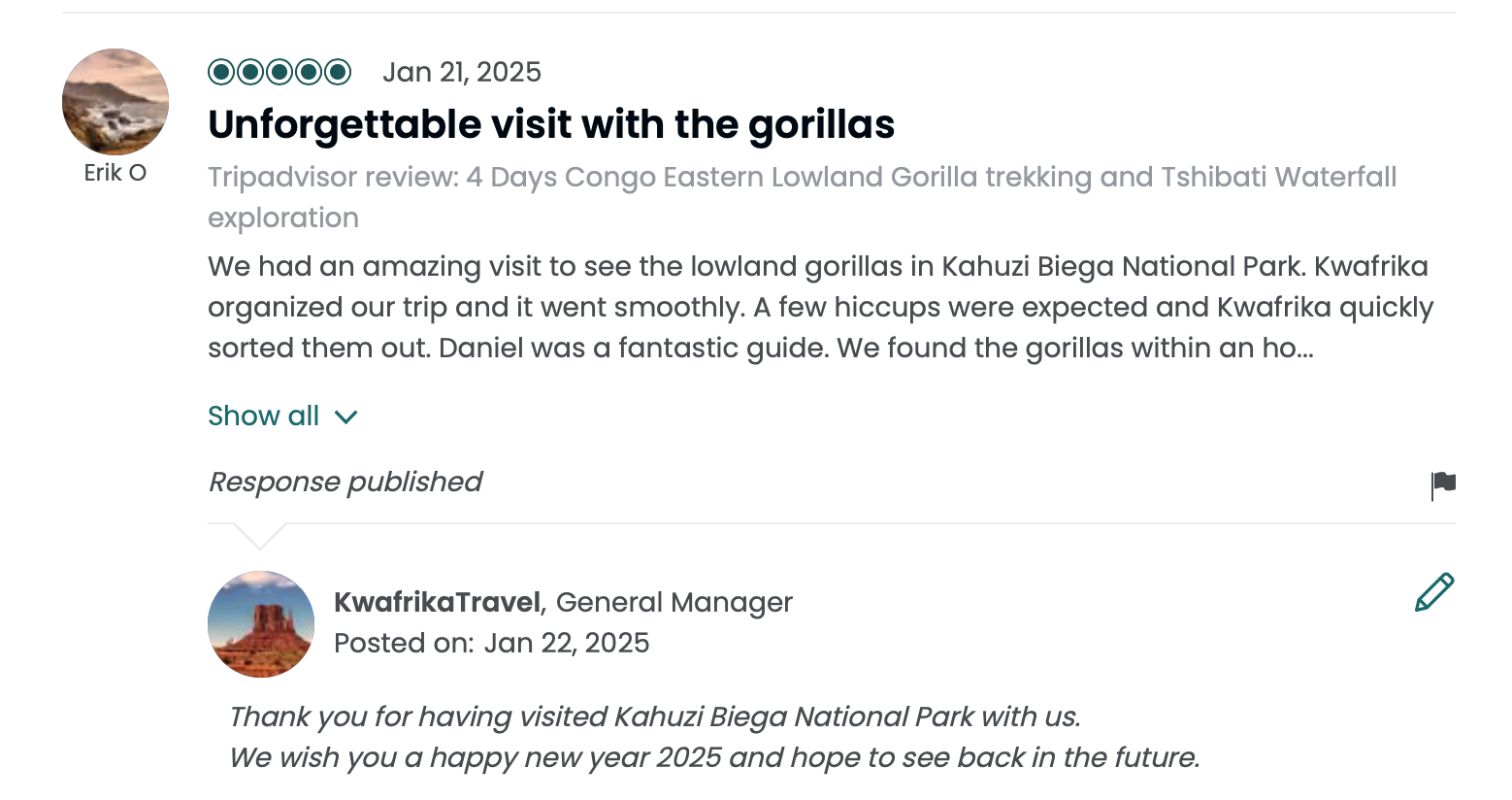 We invest 20% of our profit in community development project, thanks Programme Utalii Kwetu, we have supported environmental education of more than 10 000 kids in Eastern Congo.